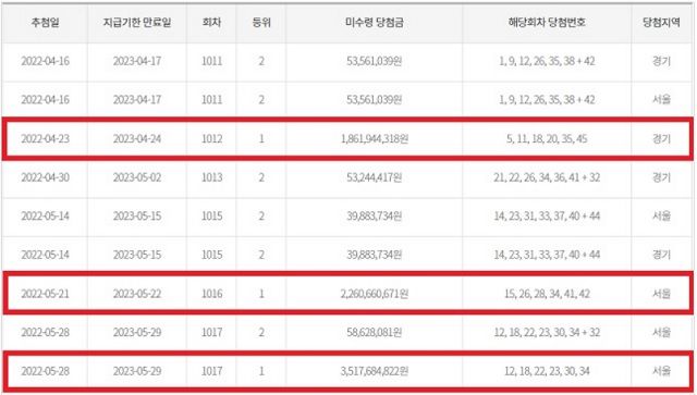 동행복권이 만기도래 2개월 이내 고액(1,2등) 미수령 로또복권 당첨금 현황 공개하고 있는 가운데 지난 4월 4일 기준 1012회차, 1016회차, 1017회차 로또 1등 미수령 당첨금 있다. 동행복권 따르면 1012회차와 1016회차 미수령 당첨자는 지급기한 막판 당첨금 찾아갔다. 1017회차 미수령 당첨금 지급 만기는 당초 공지된 5월 29일이 석가탄신일 대체공휴일로 지정, 하루 늦춰졌다. /동행복권 캡처