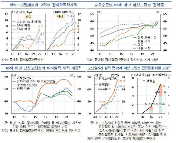 서비스 산업의 고용 확대, 교육 수준 향상 등이 65세 미만 여성 고령층의 경제 활동 참가율 상승에 긍정적인 영향을 끼친 반면, 자동화 로봇 등 기술 진보는 65세 미만 남성 고령층의 경제 활동 참가율을 떨어지는 부정적인 요인으로 작용했다.