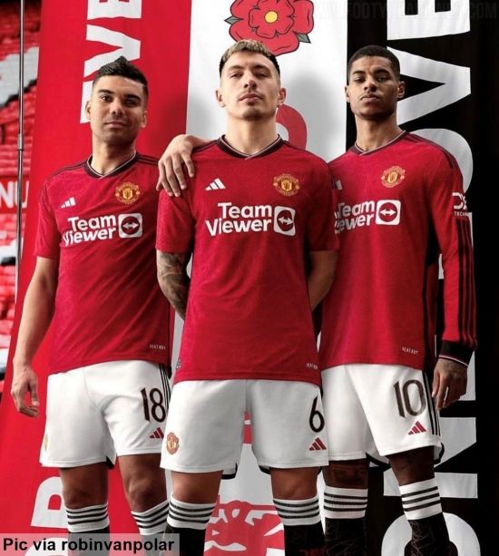 유출 샷에선 카세미루, 리산드로 마르티네스, 마커스 래시퍼드가 모델로 새 유니폼을 입고 포즈를 취하고 있다.