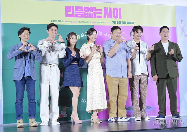배우 이지훈, 한승연, 고규필, 김윤성, 이유준, 정애연, 이우철 감독이 31일 오전 서울 광진구 롯데시네마 건대입구점에서 열린 영화 '빈틈없는 사이' 제작보고회에 참석해 포토타임을 갖고 있다.