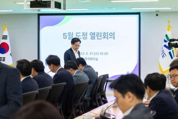 | ▲ 23일 오전 경기도청 다목적회의실에서 김동연 경기도지사, 오병권 행정1부지사, 경기도 실 ,국장 등이 참석한 가운데 도정 열린회의가 열리고 있다. |