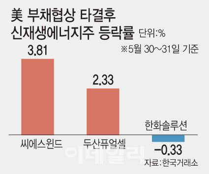 31일 마켓포인트에 따르면 지난 28일(현지시간) 미국 조 바이든 대통령과 케빈 매카시 하원의장의 부채 한도 협상이 최종 합의된 이후 씨에스윈드(112610) 주가는 3.81% 상승했다. 두산퓨얼셀(336260)은 2.33% 올랐고, 한화솔루션(009830)은 0.33% 소폭 하락했다.
