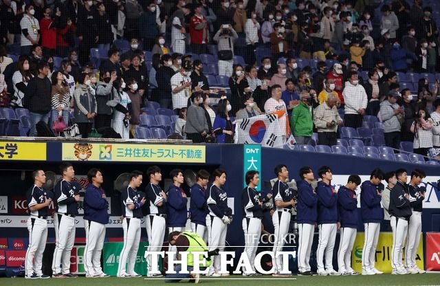 지난 3월 최악의 성적을 거둔 한국의 WBC 대표팀 선수 3명이 대회 기간 유흥주점에서 두 차례나 술을 마신 것으로 확인돼 파문이 일고 있다. 사진은 일본 프로야구팀 한신 타이거즈와 평가전에 앞서 식전 행사를 갖는 한국선수들./오사카=뉴시스
