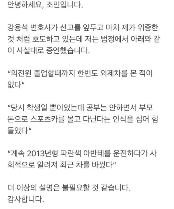 그러면서 "저는 법정에서 '의전원 졸업할 때까지 한 번도 외제차를 몬 적이 없다. 당시 학생일 뿐이었는데 공부는 안 하면서 부모 돈으로 스포츠카를 몰고 다닌다는 인식을 심어 힘들었다. 계속 2013년형 파란색 아반테를 운전하다가 사회적으로 알려져 최근 차를 바꿨다'라고 증언했다. 더 이상의 설명은 불필요할 것 같다"고 설명했다.