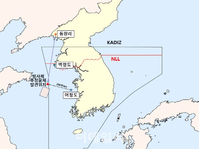 국방부는 1일 국회 국방위원회에 전날 북한이 발사한 우주발사체와 관련해 발사 경과와 군 당국 평가, 조치 사항 등을 보고했다. 국방부 현안 보고에 포함된 지도를 보면 부유물이 발견된 곳은 KADIZ 경계선에 인접한 외부이지만, 북한의 우주발사체가 KADIZ 상공을 관통해 비행했다는 점을 알 수 있다.