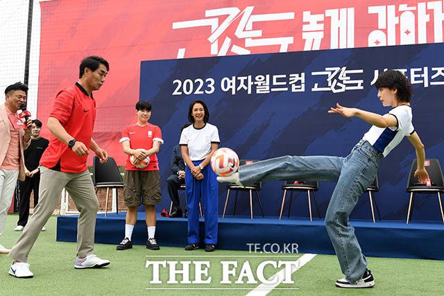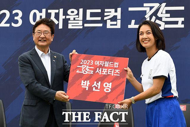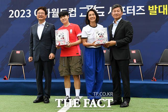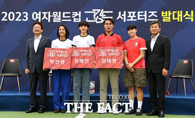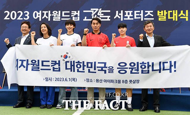 [더팩트ㅣ남용희 기자] 박보균 문화체육부장관과 배우 박선영, 정혜인, 김태영 전 축구 국가대표, 이금민, 정몽규 대한축구협회장이 1일 오전 서울 용산구 아이파크몰 풋살장에서 열린 '2023 여자 월드컵 고강도 서포터즈 발대식'에서 기념촬영을 하고 있다.