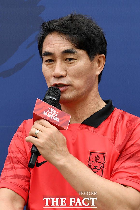 후배 이금민에 조언 건네는 김태영 전 축구 국가대표(오른쪽).