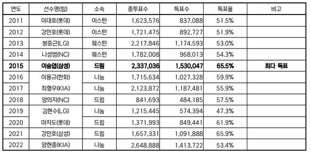 ‘베스트12’ 후보에도 역시 최고의 별들이 이름을 올렸다. 지난 시즌 최다 득표 1위에 오른 양현종(KIA)은(141만3722표) 이번 시즌 역시 나눔 팀의 선발 투수 후보로 이름을 올렸다.