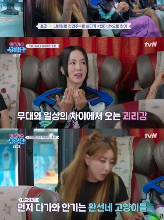 이효리는 "안무 연습하다가 집에 가면 설거지가 쌓여있다. 설거지, 청소 다 해야 한다"라며 고충을 토로했고, 엄정화는 "촬영장이랑 생활이랑 맞닿아 있는 지점이 그 지점에 다시 돌아갔을 때 되게 '뭐지?' 이런 게 있다"라며 맞장구쳤다.
