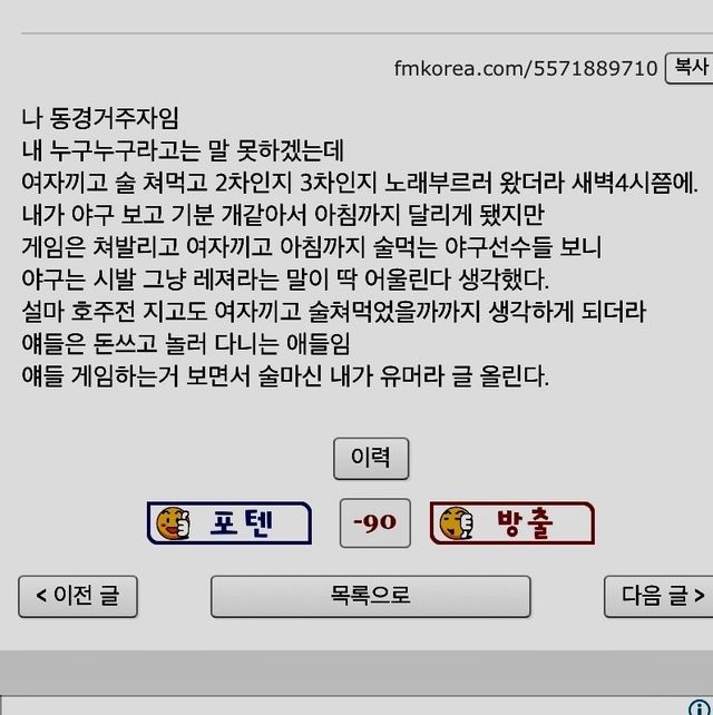 ▲ 최초 온라인 커뮤니티에서 올라온 WBC 음주파문 폭로글 / 출처 : 온라인 커뮤니티