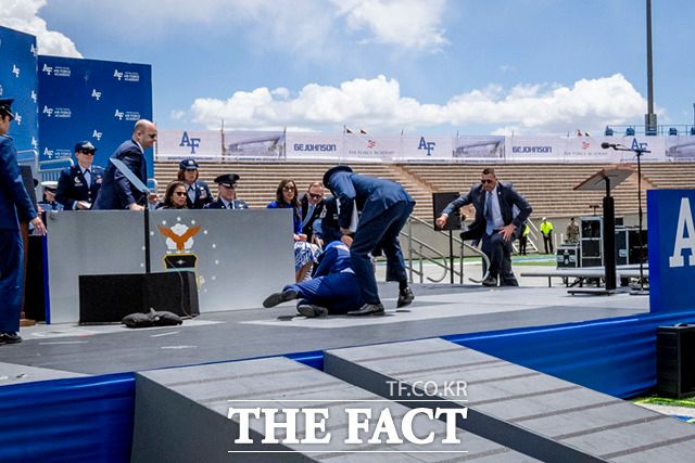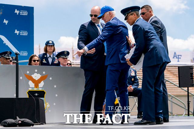 1일(현지시간) 콜로라도주(州) 콜로라도스프링스의 공군사관학교에서 열린 야외 졸업식 행사에서 바이든 대통령은 연설 후 생도들에게 졸업장을 수여하고 자리로 돌아가다 바닥에 있는 검은 모래주머니에 발이 걸려 넘어졌다.