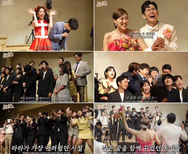 이를 본 네티즌들은 “동기들 한 번이라도 더 이름 기억될 수 있게 넣어준 게 너무 감동이다”, “이렇게 많은 분들이 함께 축가를 준비해 주셨다는 게 라라 언니가 얼마나 소중한 사람인지 느껴지네요”, “동기들 축가 너무 감동이다”, “조혜련 님은 사실 정말 대선배인데도 빼는 거 없이 온몸을 다해 축가를 준비해 주셨네요”, “개그우먼들 나오란 소리에 뛰쳐나가는 거 보고 소름 돋았어요”, “진짜 레전드 결혼식이다”, “결혼 장려 영상이다 이건” 등 뜨거운 반응을 보였다.