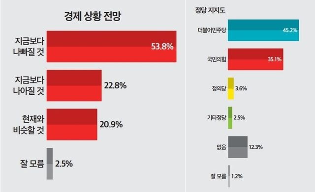 앞으로의 경제 상황 전망을 묻는 질문에는 절반 이상인 53.8%가 ‘지금보다 나빠질 것’이라고 예상했고 22.8%는 ‘지금보다 나아질 것’이라고 전망했다. ‘현재와 비슷할 것’이라는 응답은 20.9%, 잘 모름은 2.5%로 나타났다.