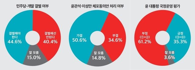 2일, 온라인 매체 <뉴스토마토>가 ‘미디어토마토’에 의뢰해 지난달 30일부터 같은 달 31일까지 이틀간 전국의 19세 이상 남녀를 대상으로 조사한 ‘뉴스토마토&미디어토마토 선거 및 사회현안 88차 여론조사’ 결과에 따르면 ‘결별해야 한다’ 44.6%, ‘결별해선 안 된다’ 40.4%, 잘 모름 15.0%로 집계됐다.