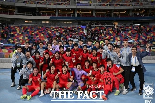 김은중 감독을 비롯한 코칭스태프와 선수들이 2일 '남미의 복병' 에콰도르를 3-2로 꺾고 8강 진출이 확정된 순간, 환호하고 있다./산티아고 델 에스테르(아르헨티나)=KFA