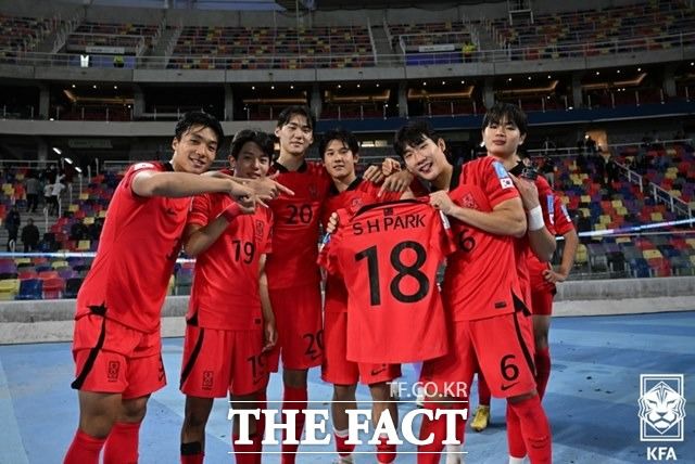 2회 연속 8강 진출의 원동력은 하나로 뭉친 '원팀' 결집력. 8강 진출을 확정한 선수들이 부상으로 조기 귀국한 박승호의 18번 유니폼을 들고 감격을 함께 나누고 있다./산티아고 델 에스테로=KFA