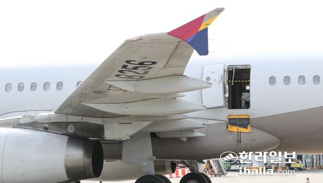 지난달 26일 오후 비상구 출입문 열림 사고로 대구국제공항에 비상착륙한 아시아나 항공기. 한라일보DB