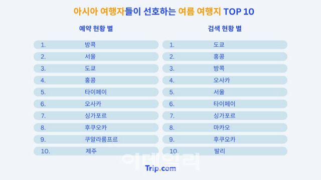 아시아에서 가장 많이 예약되고 가장 많이 검색된 상위 10개 목적지는 방콕, 서울, 도쿄, 홍콩, 타이페이 등이었다. 또한 제주가 10위를 차지해 많은 주목을 받고 있는 것으로 나타났다.