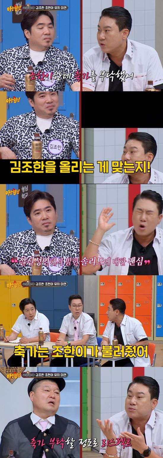 이상민은 "왜 자기 무덤을 자기가 파냐"는 출연진들의 야유에도 아랑곳하지 않고 "내가 제일 인정하는 목소리다. 김조한을 올리는 게 맞는지 내가 입 닫는 게 맞을지 고민을 많이 했다. 결국 조한이가 축가를 불러줬다"고 이야기했다.