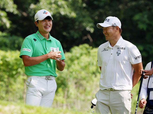 이재경(왼쪽)과 강경남이 경기 중 이야기하며 웃고 있다. (사진=KPGA)