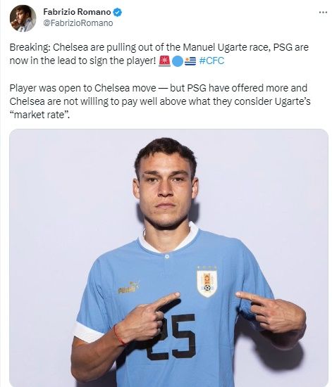 로마노는 이날 "첼시는 마누엘 우가르테 레이스에서 철수하고 있으며, PSG가 레이스 선두에 서 있다"라고 보도했다. 이어 "우가르테는 첼시 이적에 대해 열려 있었지만 PSG가 더 좋은 제안을 했고, 첼시는 우가르테의 '시장 평가액'보다 더 높은 금액을 지불할 의향이 없다"라고 덧붙였다.