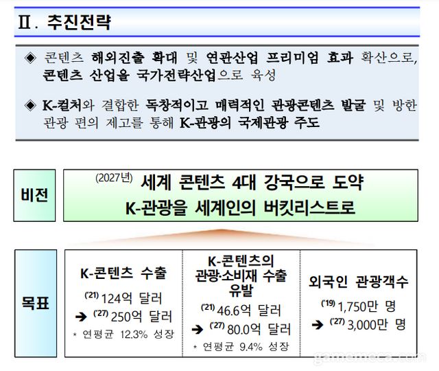정부는 5일 콘텐츠·관광 분야 수출 활셩화 추진방안을 발표했다. 이에 따르면 2021년 124억 달러 수준인 국산 콘텐츠 수출 규모를 연평균 12.3% 성장률을 달성하며 2027년까지 250억 달러까지 늘리는 것을 목표로 하고 있으며, 콘텐츠 수출 약 70%를 차지하는 게임 수출 지원도 강화한다.
