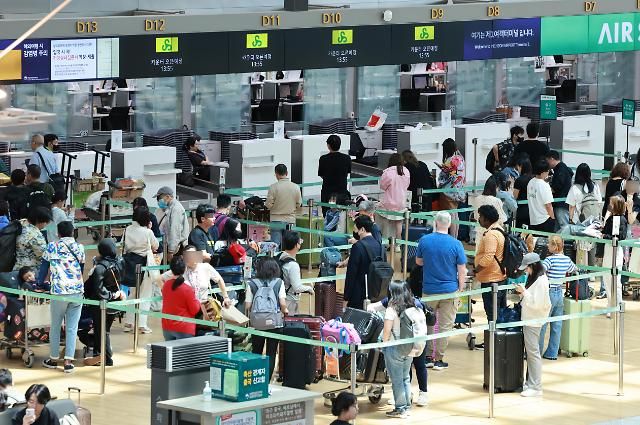 本月2日, 在仁川国际机场第一航站楼内,大批旅游排队等候办理登机手续。【图片提供 韩联社】