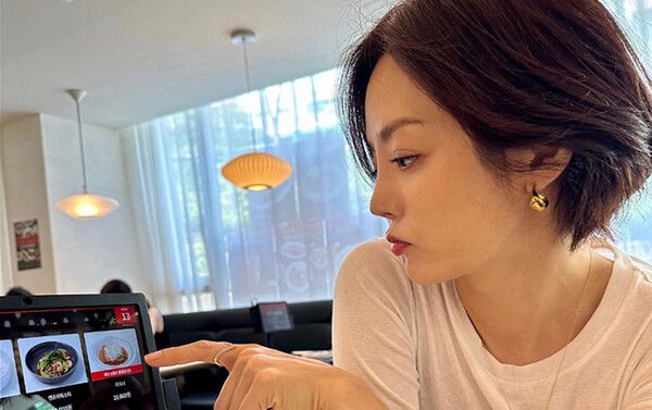 공개된 사진 속 채림은 짧은 단발머리에 수수한 흰색 셔츠를 입고 식당 음식을 고르고 있다.