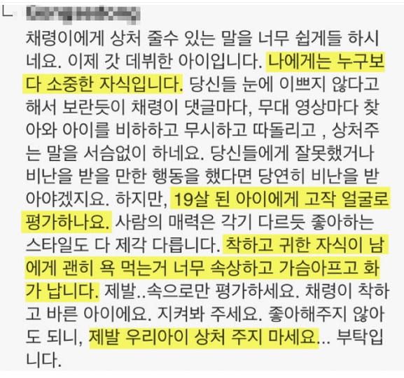 외모 비하하는 이들을 지적하기도 했습니다. "19살 된 아이에게 고작 얼굴로 평가하나요. 사람의 매력은 각기 다르듯 좋아하는 스타일도 다 제각각 다릅니다"라고 말했습니다. 그는 "채령이 착하고 바른 아이에요. 좋아해 주지 않아도 되니, 제발 우리 아이 상처 주지 마세요. 부탁입니다"라고 간곡히 부탁하며 글을 마무리했습니다.