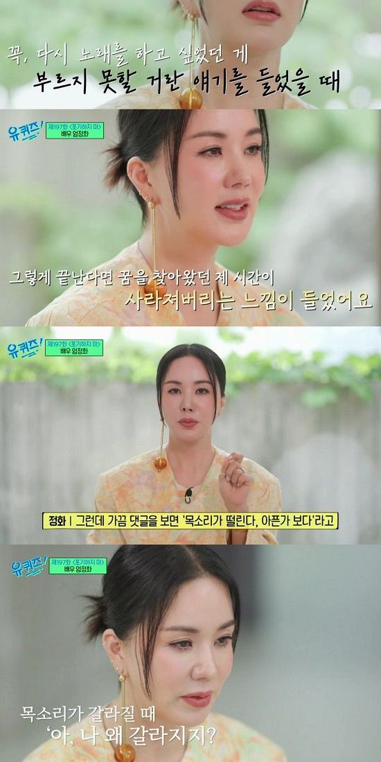 엄정화는 "사라지듯이 없어지는 것 말고 내가 해내서 무대에서 인사드리고 싶었다. 제 시간이 그렇게 끝난다면 꿈을 쫓았던 제 시간이 사라져버리는 느낌"이라며 "많이 좋아지고 있고 찾아가고 있다. 얘기하고 연기를 할 때는 다 극복했다. 가끔 댓글을 보면 '목소리가 떨린다', '아픈가 보다'라고 걱정하시는 분들이 계신데 아픈 건 아니다. 이제 여러분들도 제 목소리가 이렇다고 받아들여주셨으면 좋겠다"라고 이야기했다.