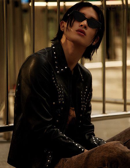 스터드 장식 가죽 재킷 가격미정 셀린느 옴므, 검은색 티셔츠 21만5천원 존 바바토스, 브라운 워싱 데님 팬츠 가격미정 미우미우, 캐츠아이 선글라스 29만8천원 젠틀몬스터 제품.
