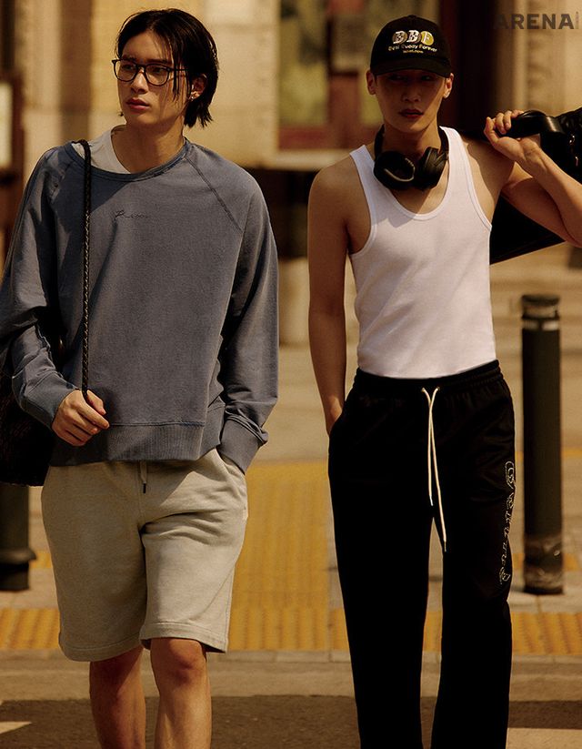 (왼쪽부터) 빈티지한 스웨트 셔츠 18만8천원 렉토, 이너로 입은 흰색 티셔츠 21만5천원 존 바바토스, 코튼 쇼츠 가격미정 이자벨마랑 옴므, 위빙 디테일의 크로스보디 백 가격미정 보테가 베네타, 라운드 프레임 안경 47만5천원 올리버피플스 by 에실로룩소티카 제품. 주얼리 장식 트랙 팬츠 가격미정 셀린느 옴므, 오버사이즈 퀼팅 백 가격미정 생 로랑 by 안토니 바카렐로, 볼캡 5만5천원 테켓, 흰색 슬리브리스 톱 에디터 소장품.