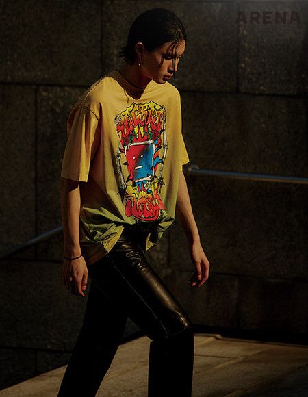 그러데이션 그래픽 티셔츠 가격미정 아크네 스튜디오, 가죽 팬츠 가격미정 아미, 벨트 가격미정 셀린느 옴므, 크로스 모티브 이어링 가격미정 크롬하츠 제품.