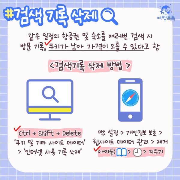 다양한 항공권 예약 플랫폼의 주장에 따르면 항공권 가격 변동은 브라우저 쿠키와는 전혀 무관하다고 하는데요. 하지만 이미 겪어봤다는 의견이 많이 나오는 만큼 쿠키를 무시할 수는 없을 것 같습니다. 따라서 최저가 여행을 노린다면 인터넷 기록을 지워보는 것도 추천합니다.
