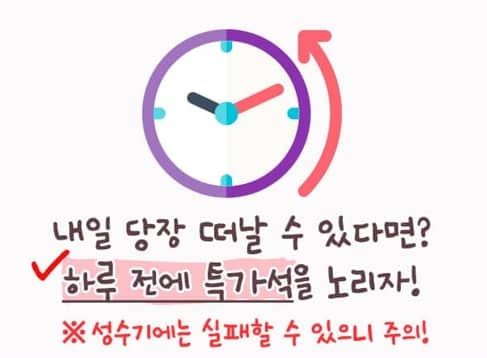 출발 전까지 공석 발생 시 항공사의 손실을 줄이기 위해 저렴한 특가석이 나올 확률이 높아져 저렴하게 항공권을 구매할 수 있습니다. 출발 당일보다 하루 전에 예약을 하는 것을 추천드립니다. 다만, 원하는 날짜와 시간의 항공권을 얻기 어려울 수 있으니 이 방법은 비수기 여행 시 도전해 보세요.