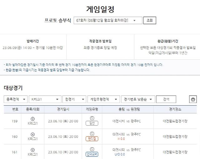 프로토 승부식 67회차 중 대전시티즌(홈)-광주FC(원정)전을 대상으로 하는 한경기구매 게임은 오는 9일 오후 2시부터 게임 참여가 가능하며, △159번(일반) △160번(핸디캡) △161번(언더오버)의 각기 다른 세 가지 방식으로 게임을 즐길 수 있다.