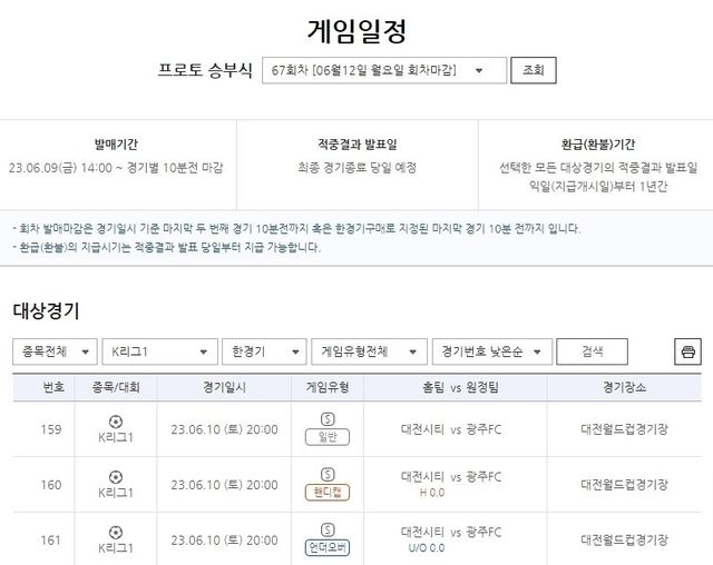 이번 프로토 승부식 67회차 중 대전시티즌(홈)-광주FC(원정)전을 대상으로 한 ‘한경기구매’ 게임에는 9일(금) 오후 2시부터 참여가 가능하며, ▲159번(일반) ▲160번(핸디캡) ▲161번(언더오버)의 각기 다른 3가지 방식으로 게임을 즐길 수 있다.