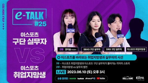 한국e스포츠협회가 서울 마포구에 위치한 이스포츠 명예의 전당에서 이스포츠 취업지망생과 구단 실무자를 초청해 ‘이스포츠를 바라보는 취업지망생과 실무자의 시선’이라는 주제로 25회 ‘e-토크쇼’를 오는 10일 오후 3시에 방송한다.