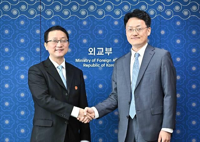 5月22日,韩国外交部东北亚局局长崔容准(右)同到访首尔的中国外交部亚洲司司长刘劲松举行司局级磋商。【图片提供 韩联社】