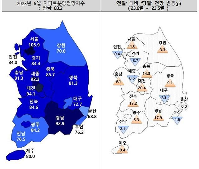 다만 △대구 7.3p(80.0→72.7) △부산 4.6p(80.8→76.2) △경기 3.7p(88.1→84.4) △전남 2.4p(78.9→76.5) △세종 0.6p(92.9→92.3) △인천 0.4p(84.4→84.0)은 소폭 하락할 것으로 전망됐다.