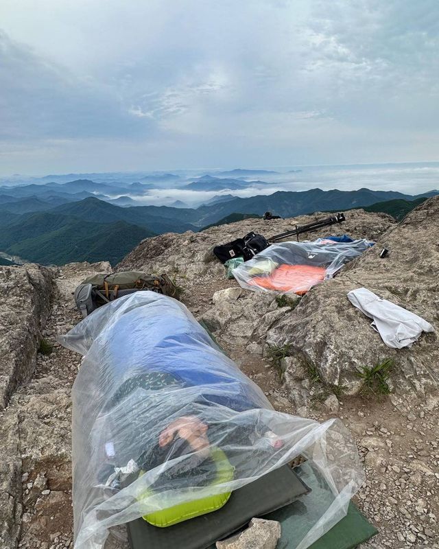 공개된 사진 속 이승윤은 커다란 비닐에 들어가 곤히 잠을 청하고 있다. 그의 앞에는 그림처럼 펼쳐진 산맥들이 펼쳐져 있다.