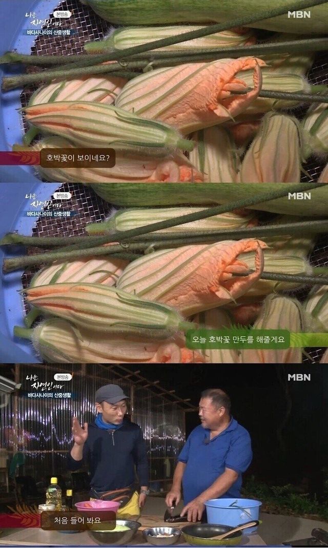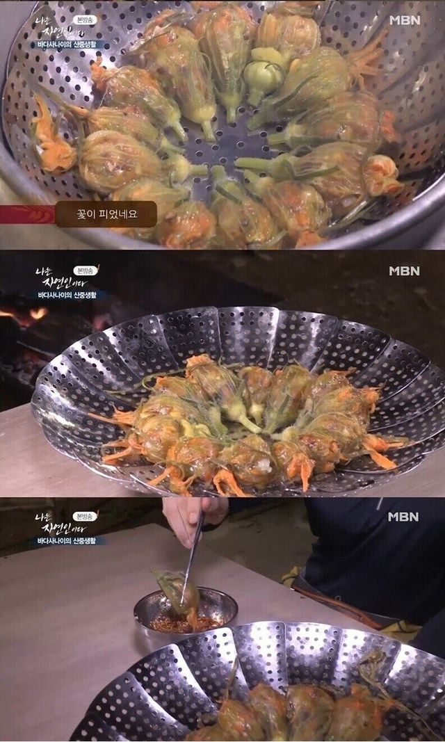 감자와 당근 등 야채와 전분가루가 버무려진 만두 속을 호박 꽃잎 안에 넣어 만두를 완성한 자연인은 흡족해했고, 이승윤도 “진짜 만두 같은데요?”라고 시식평을 전했다.