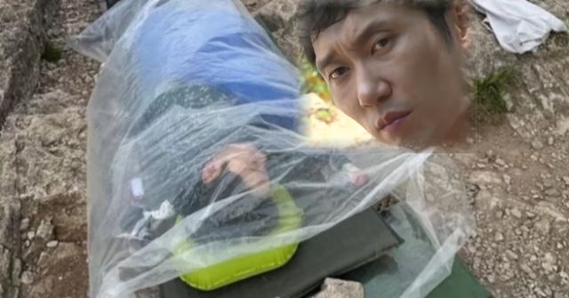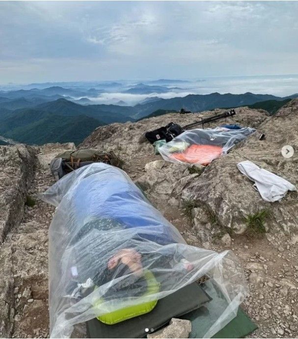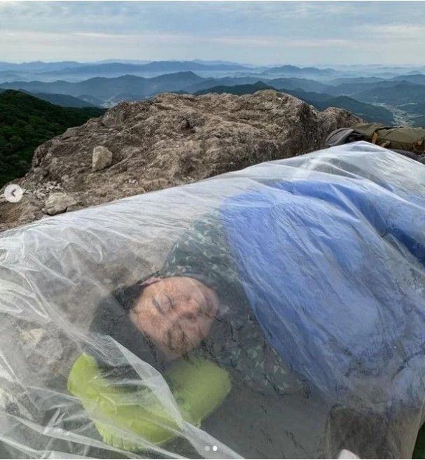 사진 속에는 비닐에 덮여 산 정상 바위에서 눈을 감고 있는 이승윤의 모습이 공개됐는데 자세히 보면 베개를 베고 침낭을 덮고 있어 비박 현장임을 알 수 있었다.