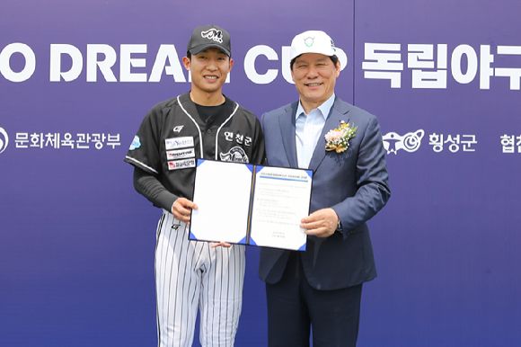 허구연 KBO 총재(오른쪽)가 횡성 KBO 야구센터에서 막을 올린 '2023 KBO DREAM CUP 독립야구대회' 개막식에 참석해 선수대표로 개막 선서를 한 최수현(연천 미라클)과 기념촬영하고 있다. [사진=한국야구위원회(KBO)]