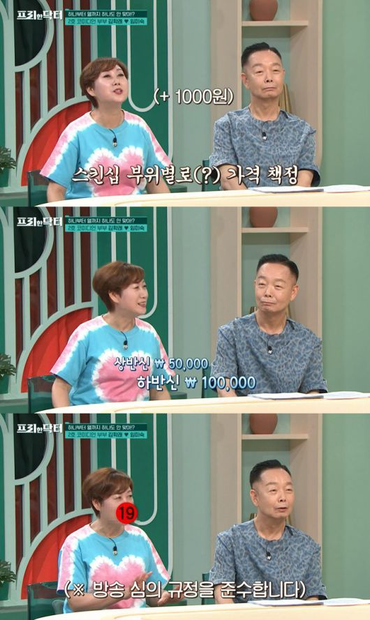또 임미숙·김학래 부부는 스킨십 관련 일상도 전했다. 임미숙이 김학래에게 스킨십을 하려면 돈을 줘야 하는 규칙이 있다고 했다. 임미숙은 "한 달에 한 번씩 뽀뽀한 거 얼마, 팔 만지면 얼마, 이렇게 정산해야 된다. 가격은 부위마다 다 다르다. 다만 김학래가 스킨십을 요구할 때는 무료"라고 했다. 예컨대 상반신은 5만원, 허리 밑은 10만원 등이다.