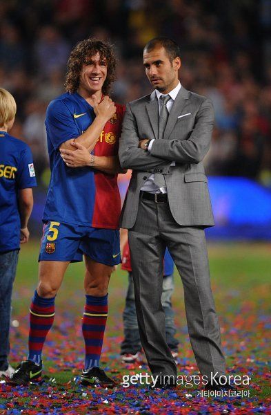 바르셀로나 시절 푸욜과 과르디올라 감독. 사진=게티이미지코리아.