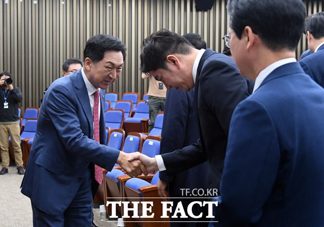 [더팩트ㅣ국회=이새롬 기자] 김기현 국민의힘 대표가 9일 오전 서울 여의도 국회에서 열린 제7차 전국위원회에 참석해 최고위원 후보들과 인사하고 있다.