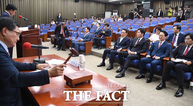 9일 오전 서울 여의도 국회에서 국민의힘 제7차 전국위원회가 열린 가운데, 이헌승 전국위원장이 최고위원 보궐선거 등 안건을 상정하고 있다. /국회=이새롬 기자