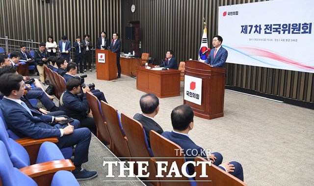이날 전국위원회에서는 '대통령실 공천 개입 논란', '제주 4·3 사건 관련 부적절한 발언 논란' 등으로 자진사퇴한 태영호 전 최고위원의 후임 최고위원을 선출한다.