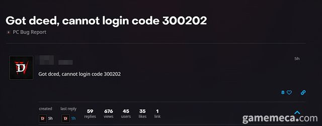 ▲ 에러코드 300202 로그인 제한에 대한 글 (자료출처: 디아블로 4 공식 포럼 웹사이트)